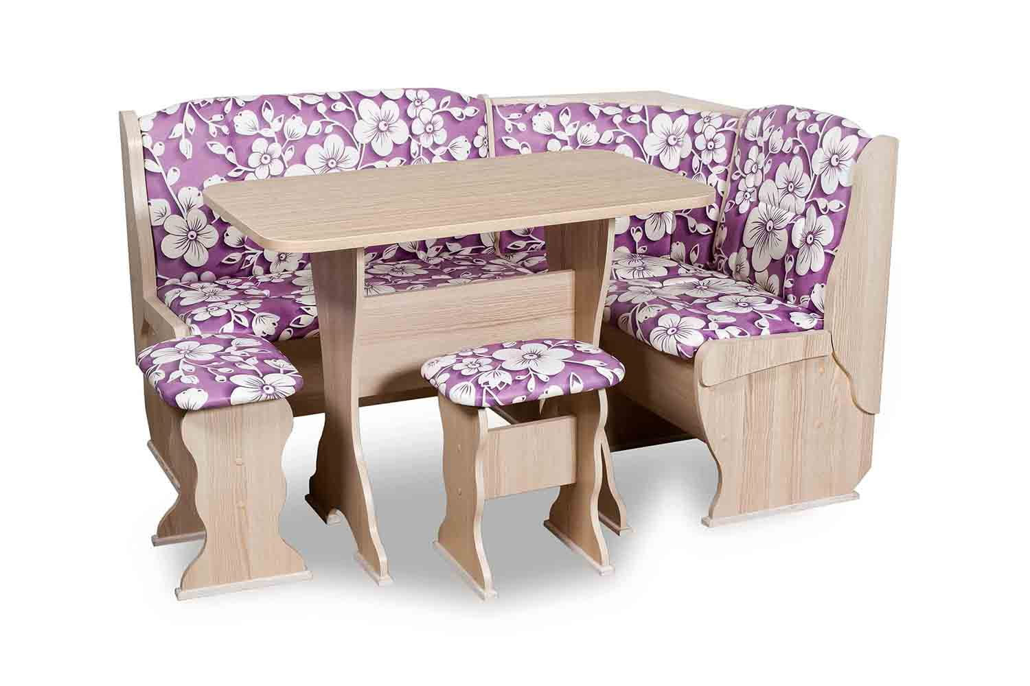 Особенности уголка: Замечательный вариант организации комфортной обеденной зоны на кухне без лишних затрат. Нежный или яркий цветочный принт на высококачественной экокоже. Большой выбор обивочных материалов позволит подобрать лучший дизайн данной меблировки, который подойдет к интерьеру и будет радовать каждый день. Кухонный угловой диван с 2 ящиками, каркас ЛДСП обработан кромкой ПВХ. Термостойкая пластиковая столешница. Угол собирается как в правом, так и в левом исполнении.